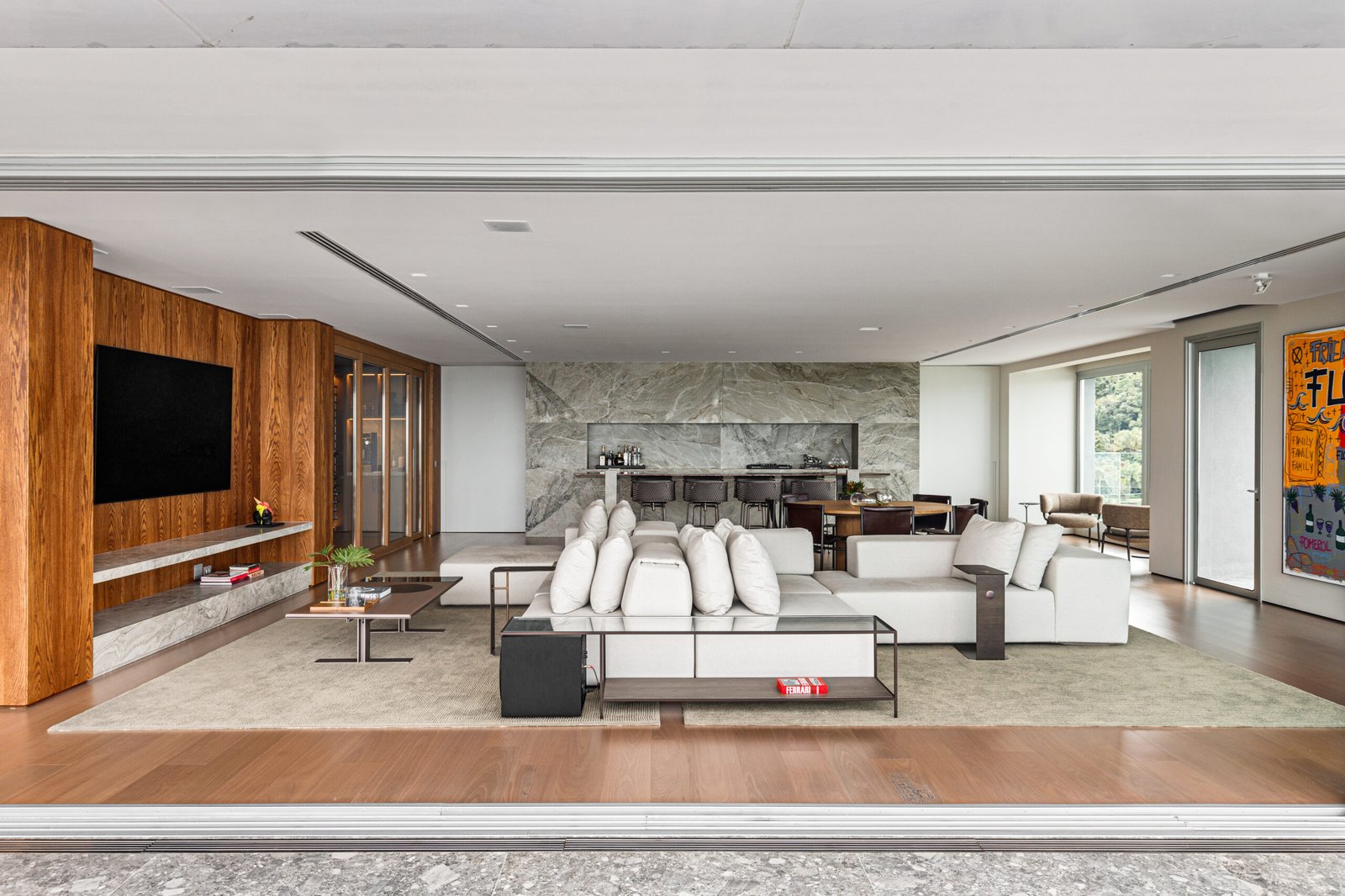 A obra do apartamento Al Mare é um marco de excelência da C.A. Guimarães Engenharia em projetos residenciais de grande escala. Com uma área total superior a 400m², o projeto foi cuidadosamente planejado para unir sofisticação, funcionalidade e acabamento premium. Cada ambiente, desde o living com mais de 90m² até a área de lazer externa de mais de 100m², foi executado com rigor técnico, utilizando revestimentos de alto padrão, marcenaria sob medida e iluminação embutida.