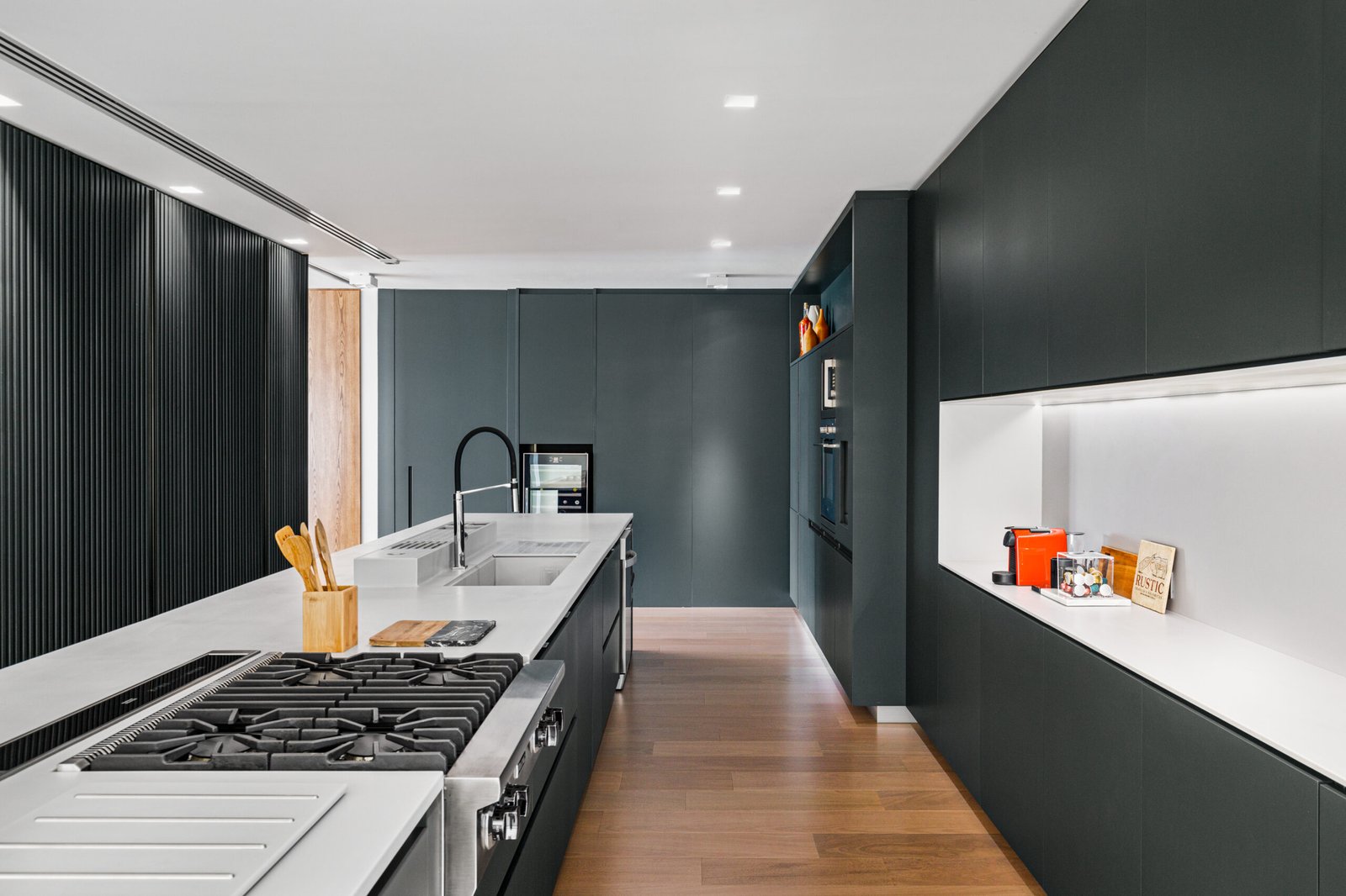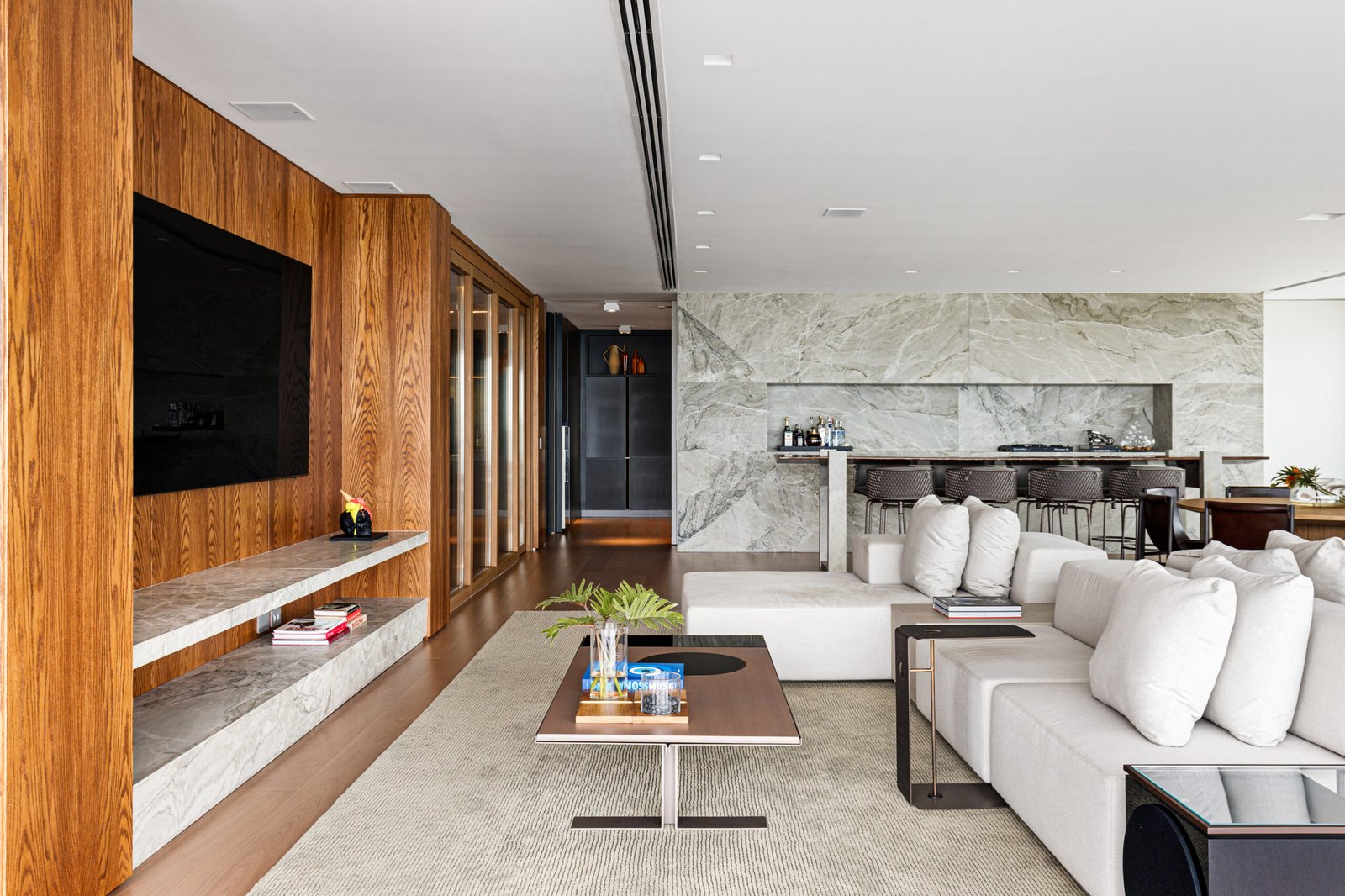 O projeto inclui detalhes exclusivos, como a instalação de cortineiros com reforço metálico, forros de gesso com acabamentos diferenciados, além de uma solução completa de climatização e automação residencial. Os banheiros foram equipados com louças e metais de alto padrão da Docol e Officina Portobello, enquanto as áreas sociais receberam pisos nobres e painéis decorativos, garantindo conforto e requinte.