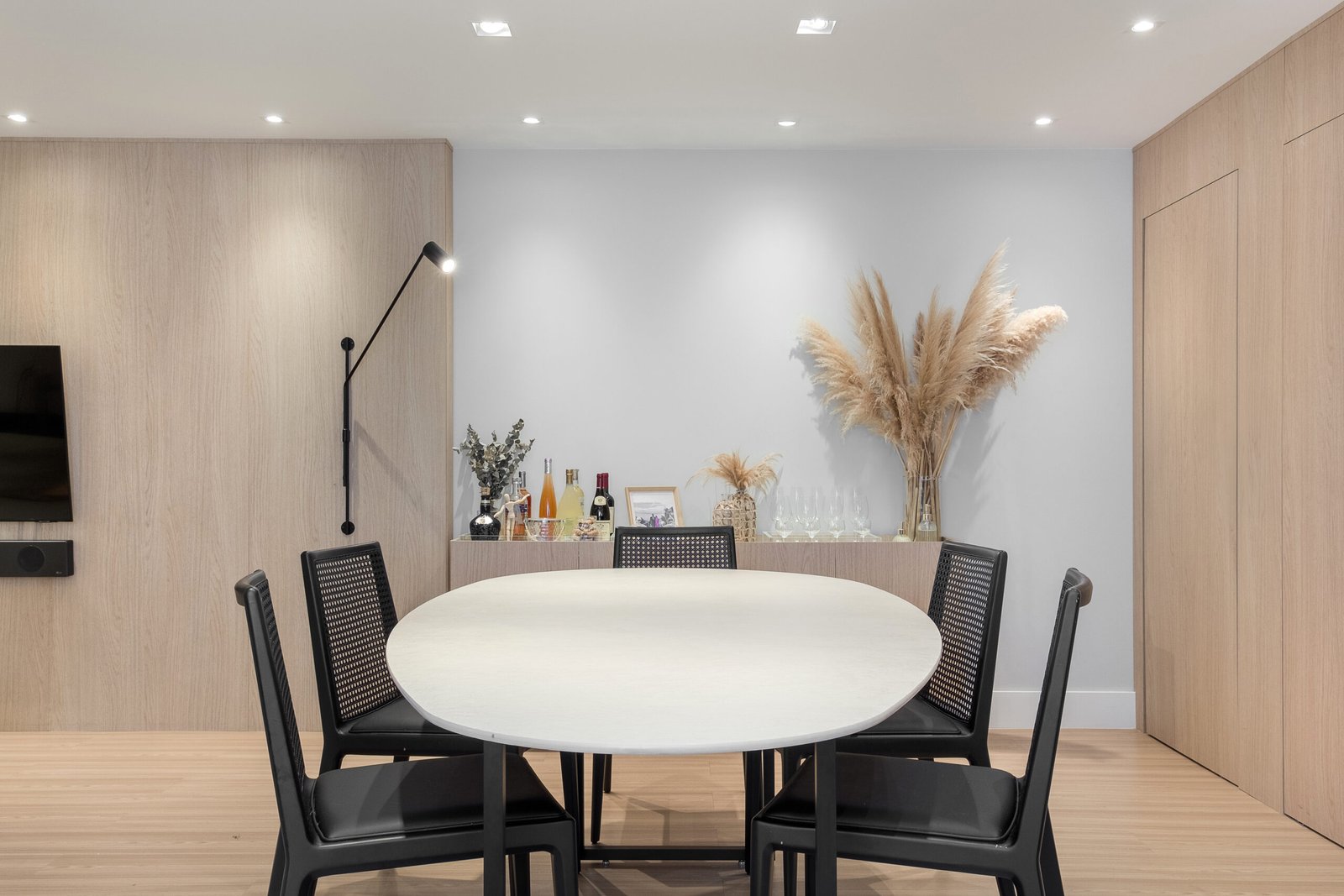O apartamento Itaparica reflete um projeto residencial pensado para unir funcionalidade, conforto e estética contemporânea. Com 87m² distribuídos em uma suíte e três quartos, o ambiente foi completamente reformado com atenção a cada detalhe, desde a integração da cozinha até o living espaçoso com acabamentos sofisticados. A marcenaria planejada com linhas retas e tons amadeirados harmoniza com o design de interiores, enquanto a iluminação embutida realça os elementos e valoriza a amplitude dos espaços.
